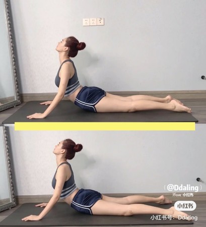 先俯卧在地面,以双手平贴地面支撑在身体两侧,慢慢抬起上半身,双腿张开贴于地面,头也可以尽量往后仰,慢慢拉伸腹部,维持15秒为一组,共做2组。