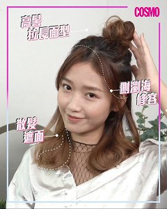 半丸子头是一个较年轻的发型,但相信也适合绝大部分的女生。首先束起发顶头发的时候,千万不要把长浏海一并束起,因为浏海卷曲后会有修容作容,而高髻就可以拉长面型,改善面型比例。若然腮骨突出的女生,就可以利用剩下来的散发遮掉腮骨线条。