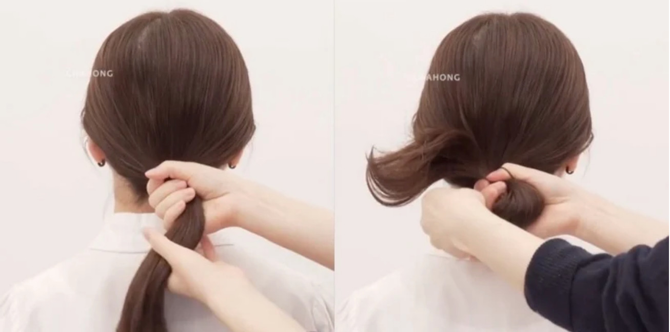STEP1:先将所有头发抓成一束低马尾。(握在虎口处)