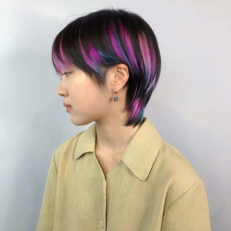 如果对颜色没特别想法,冷、暖色系都不排斥的话,不妨试试这款缤纷霓虹调,这款挑染区块是从耳上延伸至后头部,从红橙黄绿蓝紫通通来一笔,既和谐又渐层,任何短发造型搭配这样的缤纷组合其实都非常适合,推荐给喜欢与众不同的你。