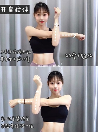 上半身保持不动,单手向上呈现90度,将另一只手臂伸直,两边各拉伸一组。