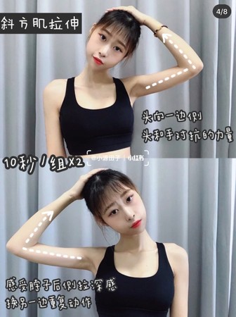 一只手放在头上,头向一边拉伸,借由头和手对抗的力量,感受脖子后侧的拉伸感,接著换另一边重复动作。