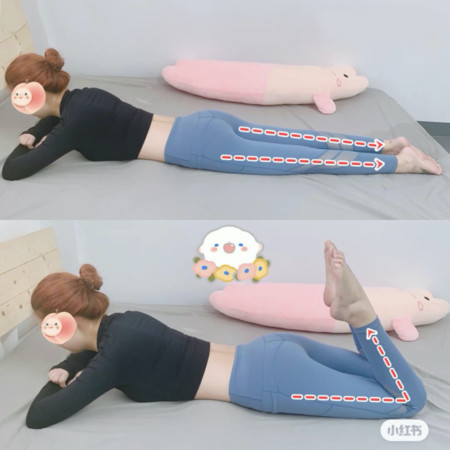 先将双腿伸直,俯卧于垫子上,双腿并拢向臀部方向慢慢弯曲并抬头,感受背部的拉伸感,维持30秒为一组,共做5组。