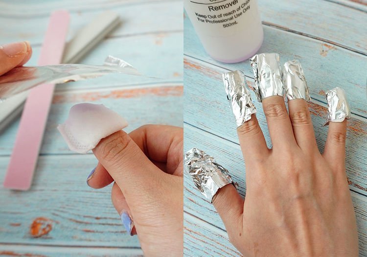 若然没有光疗卸甲包,也可用锡纸+化妆绵+光疗专用卸甲水或去光水代替。