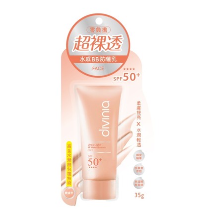divinia零负担水感BB防晒乳添加熊果叶萃取、蜂蜜精华,搭配高含水渐层包覆技术,边防晒边保湿,水润清透不黏腻,且拥有柔肤提亮、修饰毛孔与肤色的润色美肌效果,可快速完成防晒、保湿和修饰。