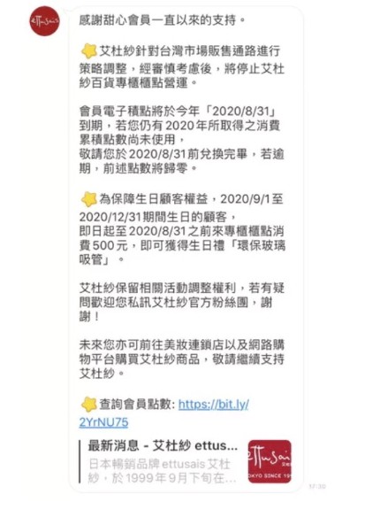 日系美妆艾杜纱确定撤柜!退出全台百货会员积点快换以免归零