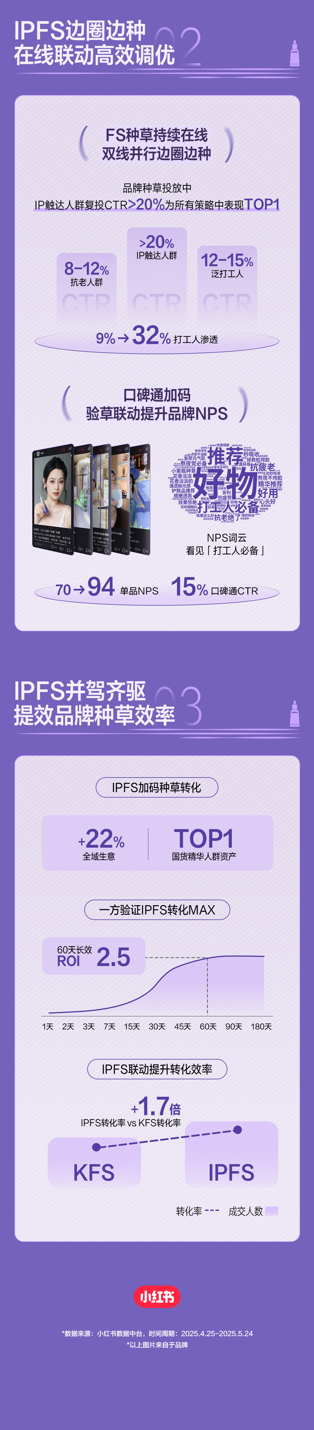 随着营销进入“精耕细作”时代,单次的IP曝光已难以支撑品牌对长效增长与量化结果的诉求。实践案例证明,品牌合作⼩红书营销IP的同时,如果与FS产品种草策略相互协同,有助于进⼀步对话消费者,放⼤品牌在⼩红书的营销种草成效,为品牌撬动更⼤的营销收益,收获更丰富的经营资产。