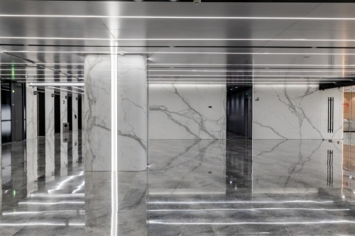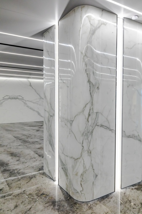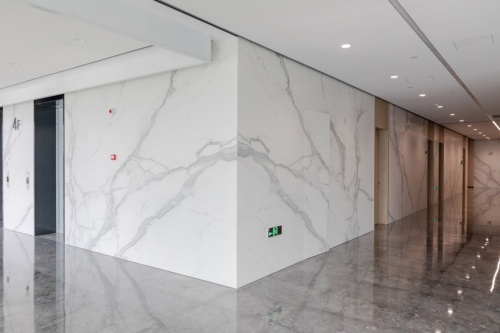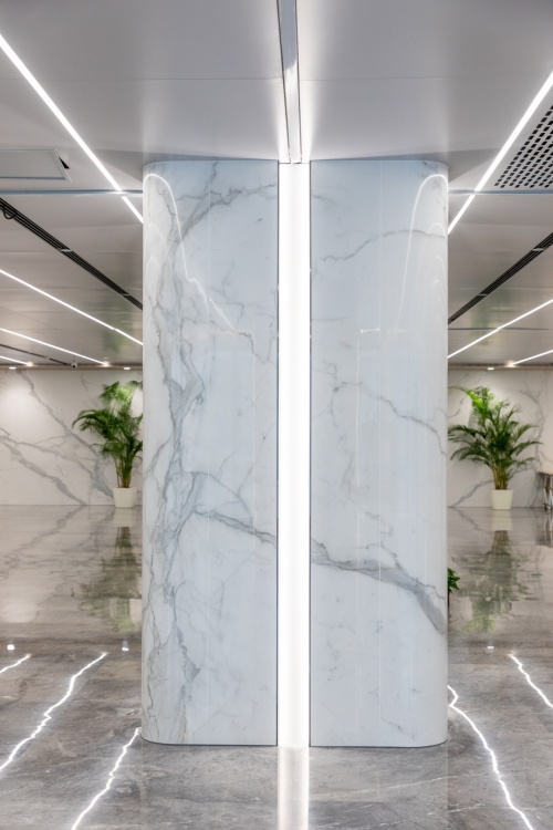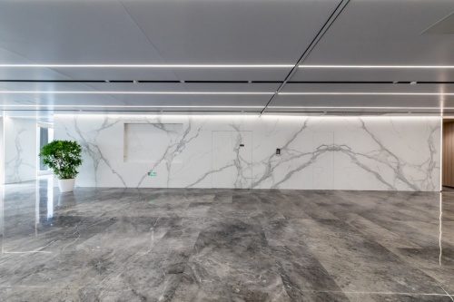 大厅色彩清晰明快,顶部均匀分布的线型灯带让整个空间更加具有科技感,由马可波罗曲面岩板打造的方柱将空间的高级氛围做了进一步提升,墙面使用马可波罗岩板轻纱鱼肚白定制连纹产品,1600mm*3200mm超大规格,使得产品纹理更加完整,且留缝少,更贴近天然石材的铺贴效果,实现原生态无界视觉效果。