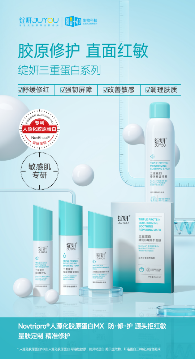 产学研一体化的研发结构,使得绽妍生物在研究成果转化的过程更加顺畅。目前,绽妍生物已经将最新的科研成果应用到产品的研发生产上。经过科学比例复配,绽妍生物研发团队推出的专研生物科技配方——Novtripro®人源化胶原蛋白MX,已应用到绽妍三重蛋白系列产品中。