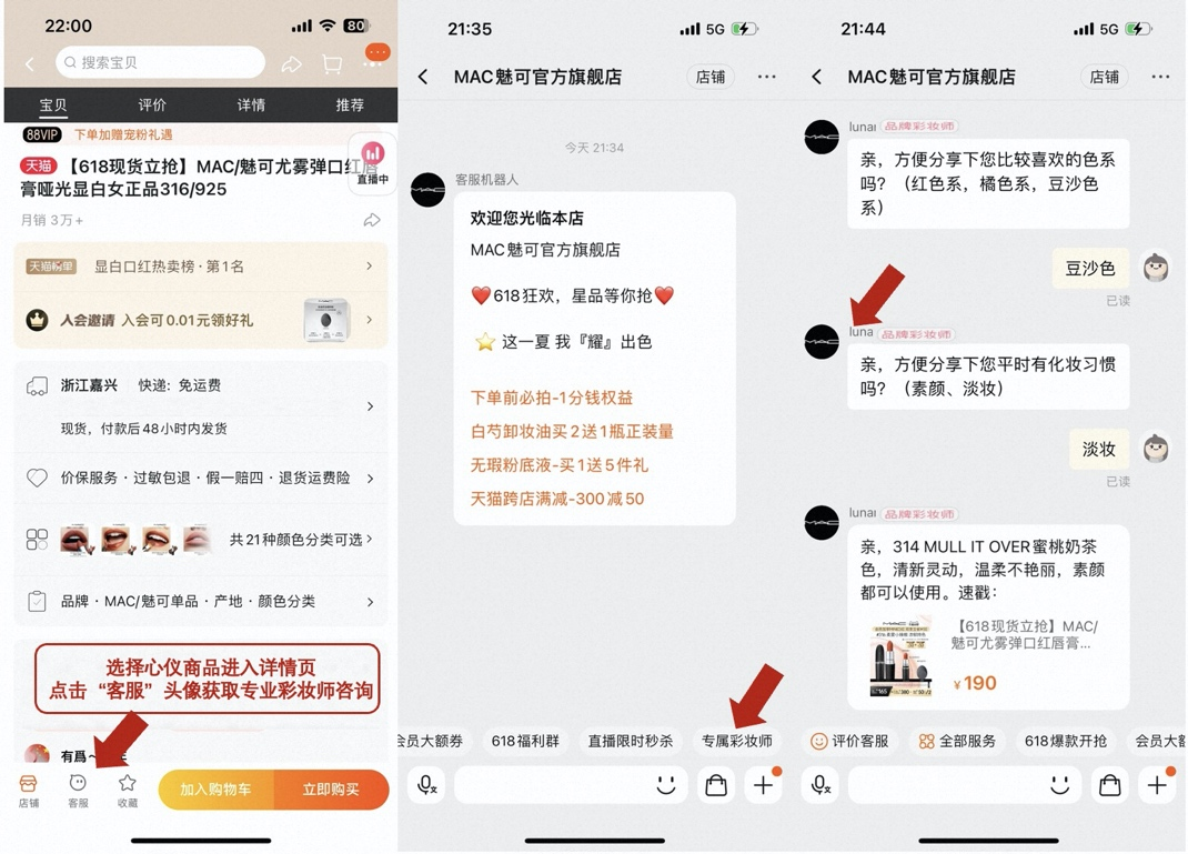 目前已有不少网友提前尝了鲜。618预售期间,MAC魅可官方旗舰店开放彩妆师入口做测试,数据显示,彩妆师咨询接待量要比普通客服高出72.7%,消费者咨询的问题主要集中在妆容妆造、产品适用等方面。