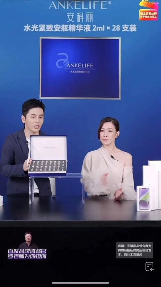 “安瓶是高浓缩精华,一瓶功能非常强大,能全方位的呵护你的肌肤,不仅能补水嫩肤,还有效淡化细纹,紧致肌肤,让肌肤时刻保持弹性,并且里面含有的多肽成分能够撑起肌肤胶原,让肌肤紧致澎弹……”交个朋友直播间不断给观众输入安瓶精华的强大功效,同时佘诗曼也配合主播分享了自己对安瓶精华的了解及精华日常使用方法。