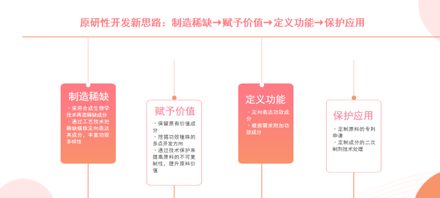 为挖掘更适合客户的需求原料,肽源集团打破传统的思维,将原研性开发新思路制定为:制造稀缺、赋予价值、定义功能、保护应用。制造稀缺就是采用合成生物学技术再造稀缺成分,通过工艺技术把稀缺植株定向表达其成分,丰富功效多样性。赋予价值就是保留原有价值成分,通过挖掘功效植株的多点开发方向,通过技术保护来提高原料的不可复制性,提升原料价值。功能定位就是定向表达功效成分,根据需求附加功效成分。保护应用就是定制原料的专利申请,定制成分的二次制剂技术处理。肽源集团通过功能定位可以帮助企业挖掘更多的原料,提升生活活性物的有效性和价值性,从而更好确立原研性开发体系的方向和目标。