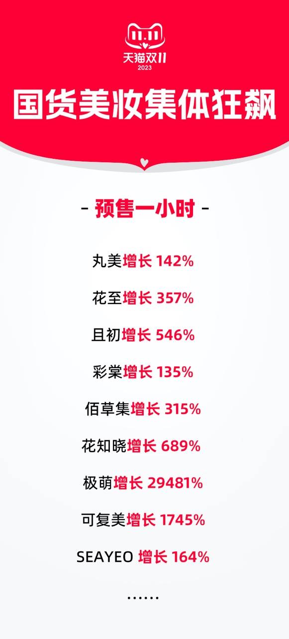 新锐国货增长强劲。可复美、优时颜、瑷尔博士、且初(美妆)、颐莲、可丽金、优斐斯、东边野兽等数十家头部品牌首日成交额超去年双11全阶段;HBN、至本、溪木源、谷雨、fanbeauty、兰、biomeso等上千家新锐护肤品牌获得2位数高增长;国货彩妆以更高性价比,获得中国女生的青睐,开售一小时,彩棠增长了135%,花知晓增长689%……