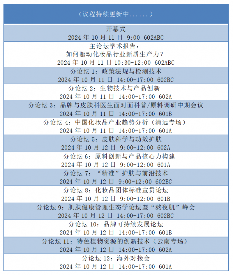 随着中国化妆品法规体系的不断完善、产业链的逐步延伸完整、消费者科学理性消费观的形成,整个化妆品产业有了质的变化。新挑战的同时也伴随着新机遇。本次论坛将设有1个主论坛+11个分论坛+3个专场活动,同时特设专题会议、资源对接会、招商推介会和行业热点话题研讨活动。议题包含新政策与法规解读、特色植物资源、生物技术、原料创新、打造纯净原料、产品核心力构建、品牌可持续发展、产业趋势、精准护肤、皮肤科学科普、熬夜肌破解、化妆品出海等,此次论坛将围绕关键议题,展开横向与纵向的探讨,与您一起探寻发展新机遇。