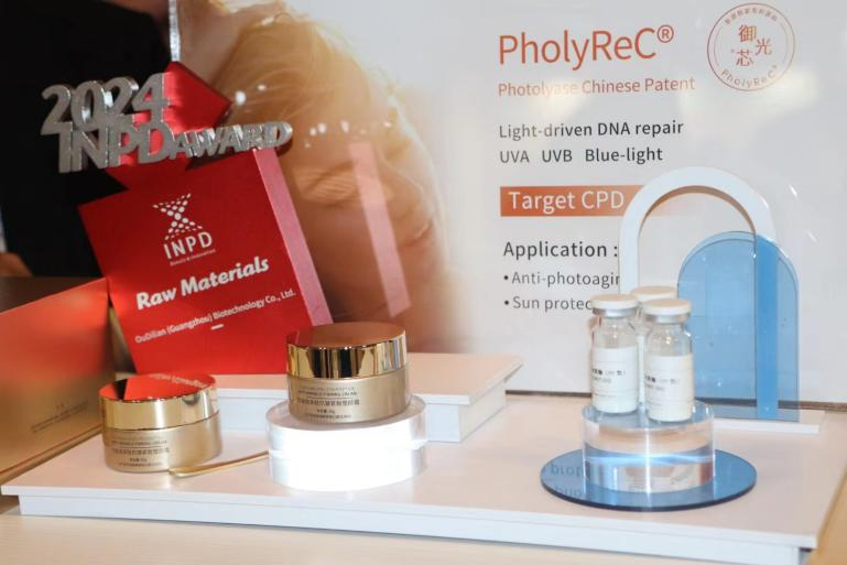 此次入选的PholyReC®光修复酶,是利用基因重组技术从嗜热栖热菌提取出光裂合酶(诺奖成分),是一种高效、专一的修复细胞内DNA损伤的酶。经过细胞、动物及人体功效三重验证,PholyReC®光修复酶能够有效修复因紫外辐射导致的细胞内DNA损伤,并降低炎症因子IL-6、IL-1β和TNF-α的表达。此外,它还能抑制ROS活性氧的产生,从而改善由紫外线照射引起的光老化、皮肤松弛,皱纹与色沉等肌肤衰老现象。该成果斩获三项国家发明专利,并荣获2024年 INPD 国际创新原料奖章,充分彰显肽源生物在化妆品原料创新领域的深厚造诣与卓越品质。