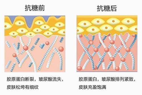 糖分摄取对身体来说是保障机能正常运作必要手段,平时我们的正餐里主食、蔬菜已经隐藏了很多非游离糖。但手里的零食、下午茶、甜品、快乐水停不下来,就会导致摄入的糖分过量~消耗不掉的糖分会与体内的蛋白质作用,进而产生一种叫AGE的物质。糖基化产物AGEs不断产生和累积,当其累积到一定程度,直接导致胶原纤维变硬或断裂,并损害其再生能力,最终皮肤开始老化、焦化、褐黄化,且不可逆。所以,以上就是冻龄女神张韶涵戒糖十年、气质女星张馨予等明星总会对糖类拒之千里的原因,健康抗糖化的正解是:饮食、生活和护肤。