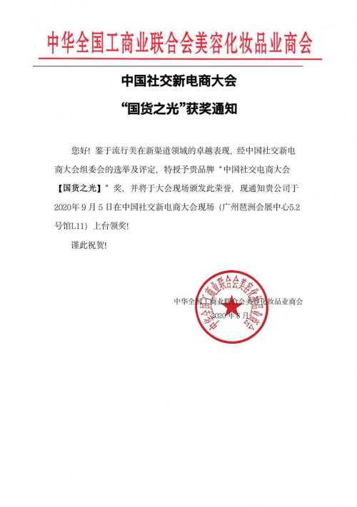 9月5日美博会期间,经中国社交新电商大会组委会的选举及评定,特授予流行美“【国货之光】”奖,并于中国社交新电商大会现场颁授。