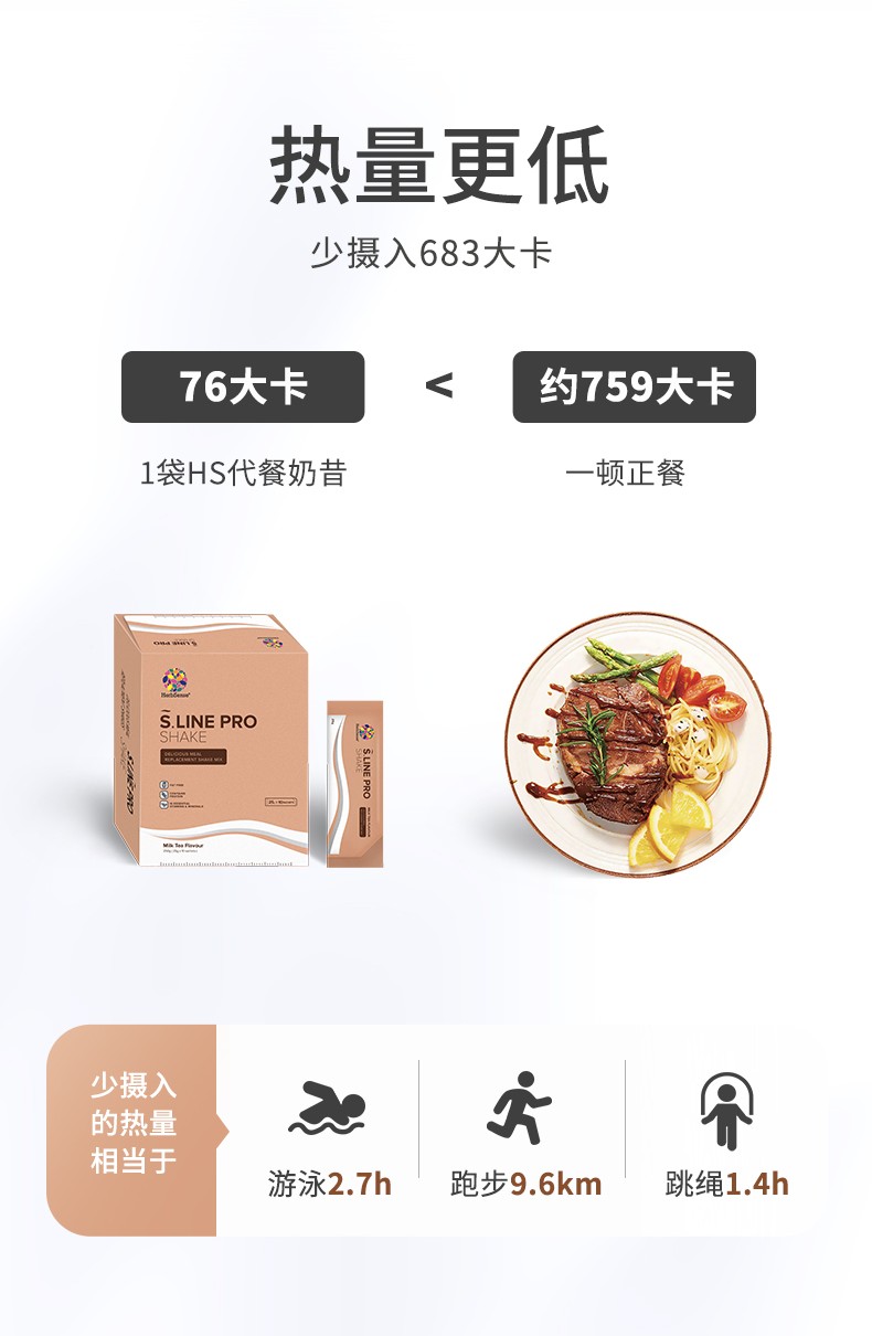 日常我们摄入一顿正餐约700多大卡,而Herbsense贺柏圣代餐奶昔每包热量仅有76大卡,比一只苹果都要低,饱腹时间却可以长达4-6小时,算算其中的热量差,少了多少运动量燃掉多少脂肪啊。