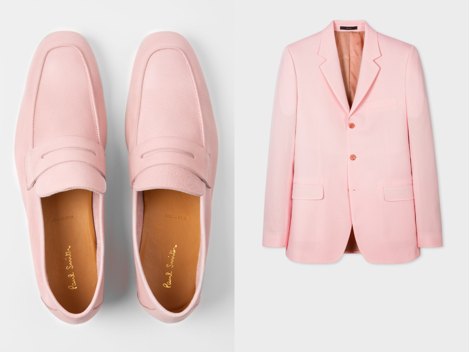 男生也能驾驭淡粉色系单品,英国设计师品牌Paul Smith就是最好的例子,西装外套、长裤 、乐福皮鞋