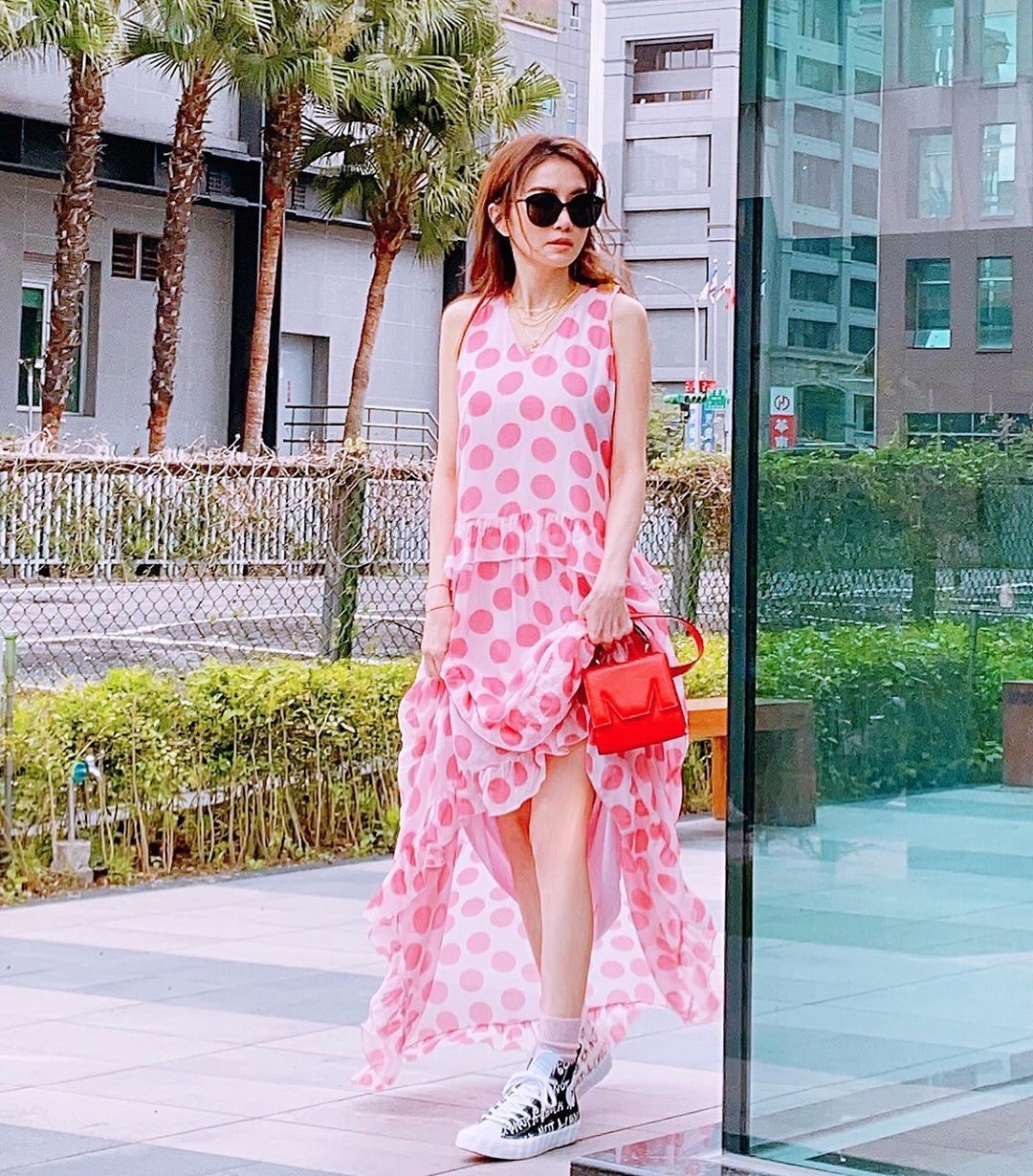 波点造型万年不退流行,哪怕是口罩期也不例外,姐姐谢金燕日前就亲自带货了Blumarine粉桃红波卡圆点长洋装,运用轻柔薄纱质地打造裙䙓飘舞的浪漫感,而淡粉与深色波点的完美融合也交织出春夏的活力感,最后手提MSGM的桃红包款搭配,美到让人窒息。