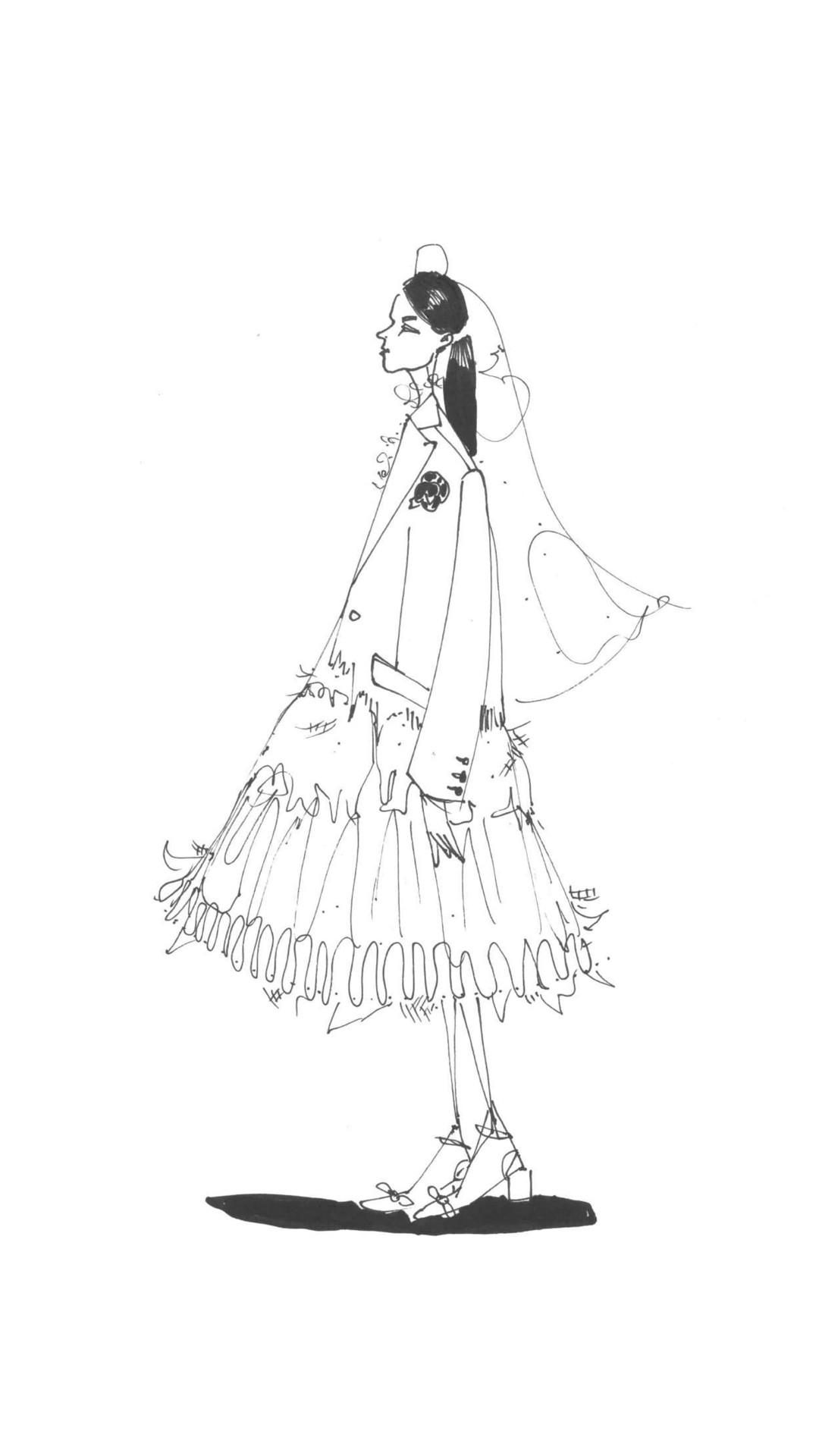 除了Angelababy的科技感演绎,品牌本季最大亮点莫过于将婚纱解构重组,使得造型化作时装穿著,从曝光的设计草稿便能看出天马行空的想像力,甚至直接让猫咪穿上深V礼服以及高跟鞋,让人瞬间充满童心。其馀单品包括,T 恤和短裙在薄纱和针织衫的破碎白色阴影中相互碰撞,变成了褶皱和分层的单件衣服,蒙著面纱的衬衫以及开衩的连身裙;黑色皮革、白色缎布和破旧的蓝色牛仔布剪裁的披肩领运动夹克两边分开,穿著时可以笔直垂下,或是系在身上,而纯白工作外套则带著一束朦胧的郁金香花再次出现。