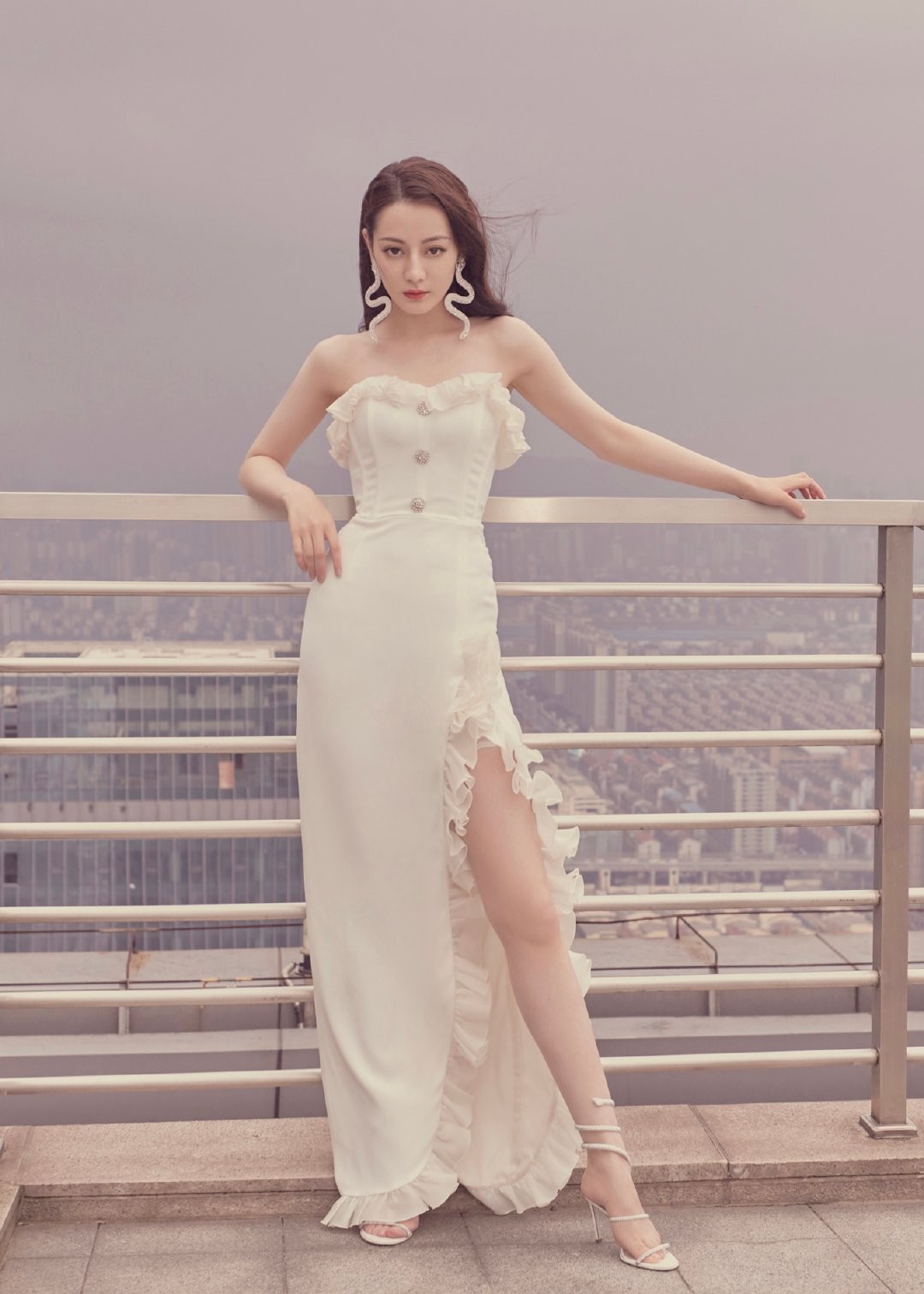 迪丽热巴在新剧《幸福,触手可及》中饰演直爽的设计师周放,为宣传戏剧近日频频曝光,日前迪丽热巴就以义大利时装品牌Alessandra Rich的荷叶边高开衩长裙亮相,只见简洁白色裙装完美包覆迪丽热巴的S曲线身型,使得肌肤更为白皙,裙身则运用钻饰排扣点缀丰富视觉效果,加上耳间的蛇型耳饰展现曼妙姿态。视线向下看,下䙓再以荷叶边收尾,与高开衩至腿根的设计巧妙呼应,令迪丽热巴的修长美腿大方见客,整体造型游走于火辣与霸气之间。