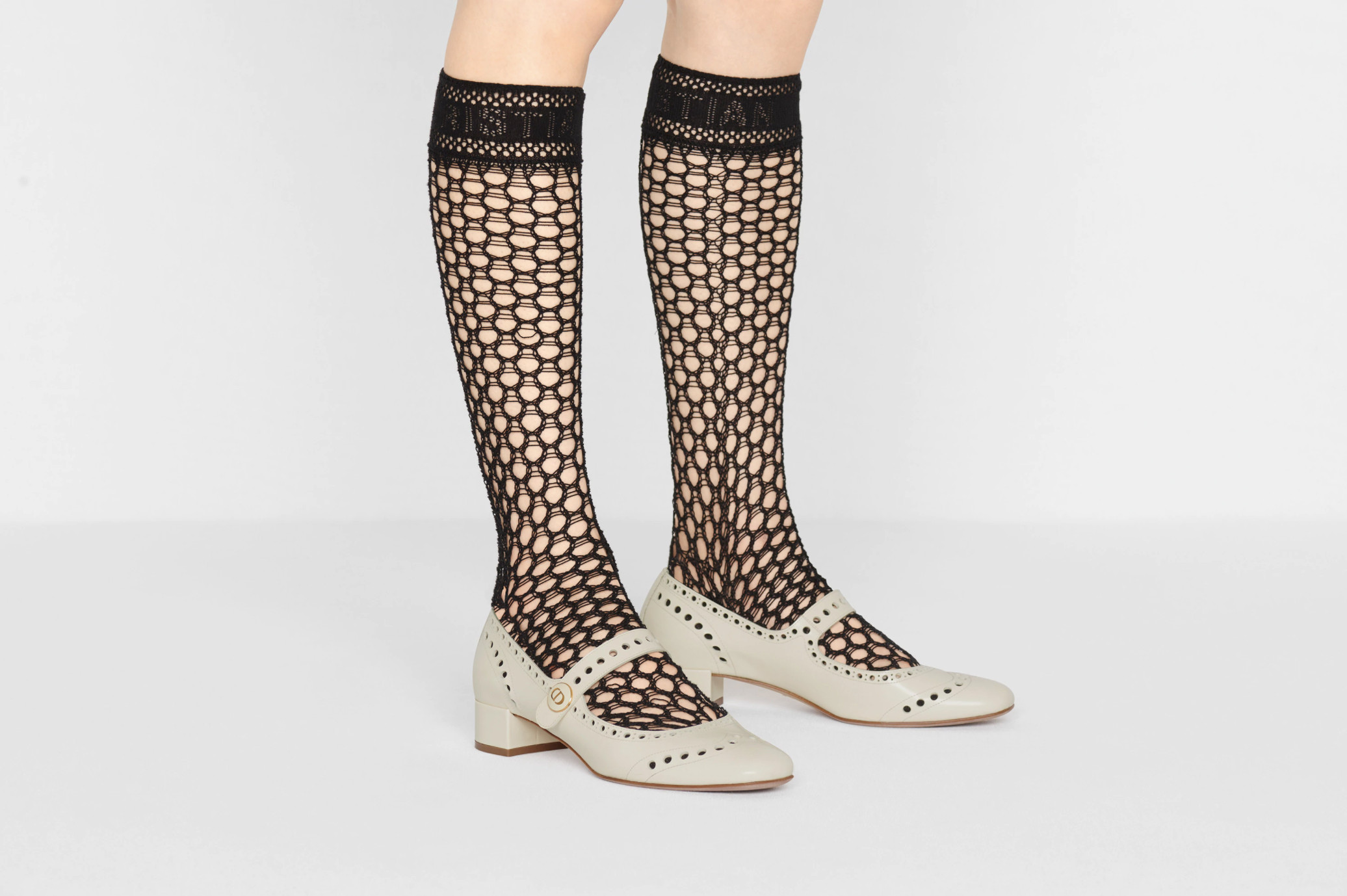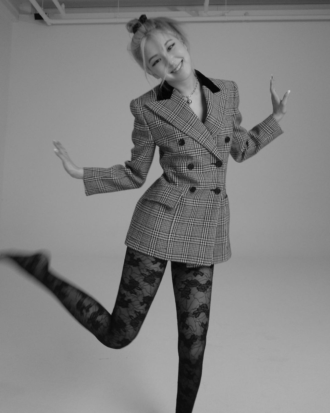 前阵子在IG上晒出穿搭的秀智,穿著有点正式的西装及学院风格纹短裙,却反差搭配DIOR洞洞丝袜,意外地甜美惹火,优雅造型也更加吸睛,脚踩珍珠米白的玛莉珍鞋与黑色洞洞袜做出对比,让焦点集中在她的长腿上。