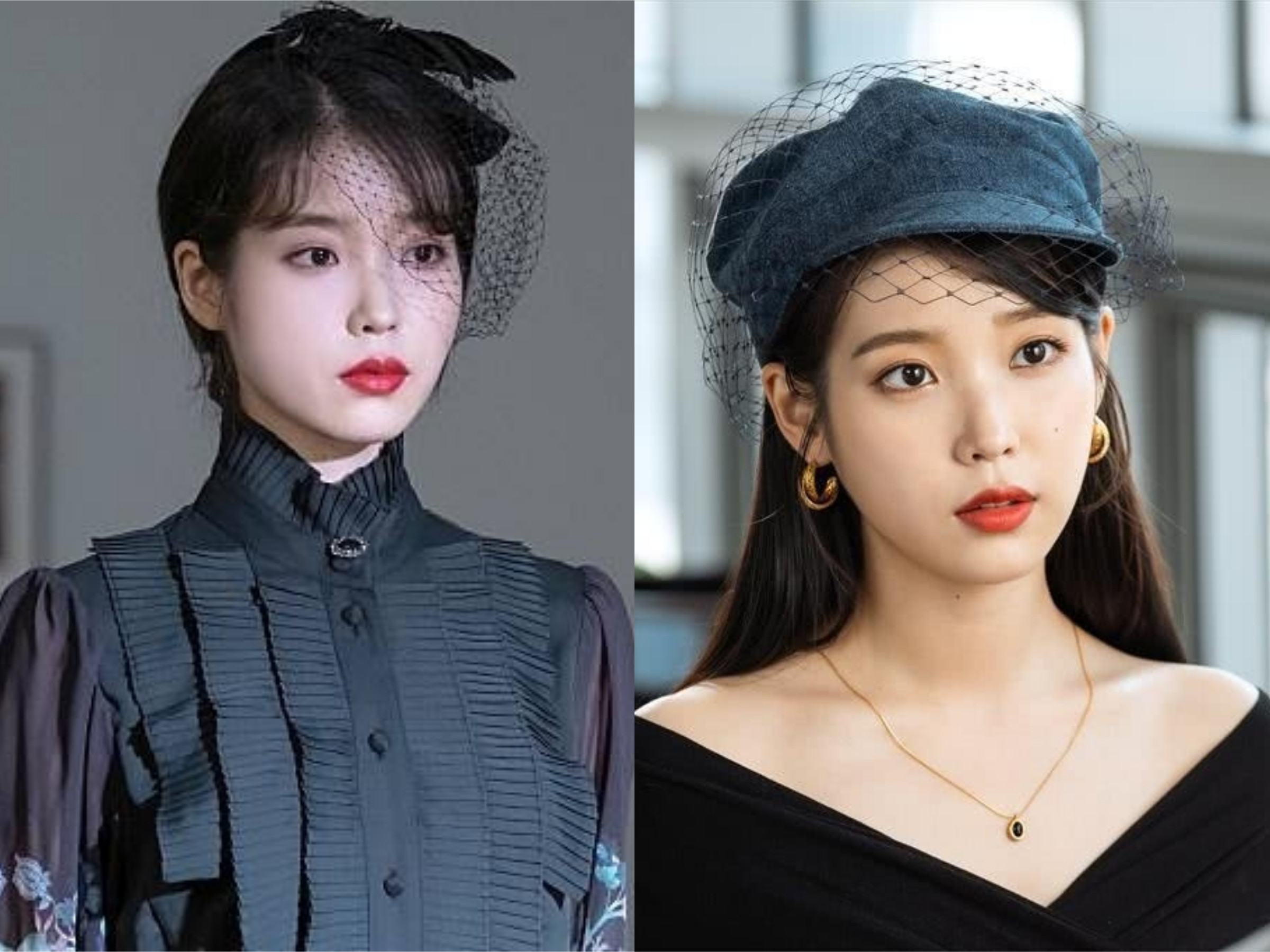而盘起的头发上戴上了黑色网纱帽,并点缀了些许闪亮水钻,搭配显眼的大红唇,气势妆容更加营造了神秘与性感的气息,让人不禁联想到IU在《德鲁纳酒店》剧中曾出现过的造型风格。