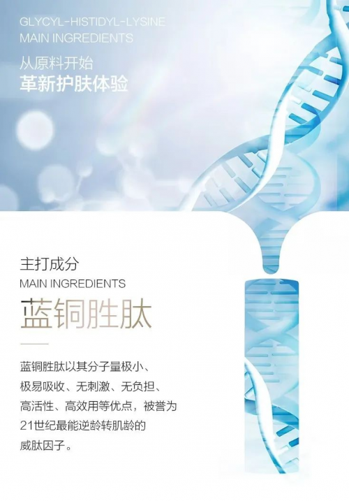 蓝铜胜肽是抗衰必不可少的奢华保养成分,它可以提升肌肤紧致与弹力,减少细纹,改善肌肤弹性。抗衰效果显著。