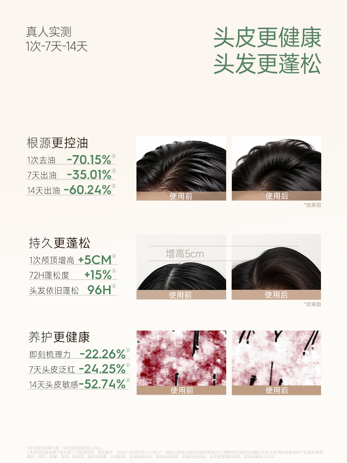 通过“双超”协同作用(超高浓度精华+超渗透技术),实现头皮与毛囊的“双维养护”。从根源解决蓬松不持久的痛点,让发根健康强韧,蓬松自然持久。