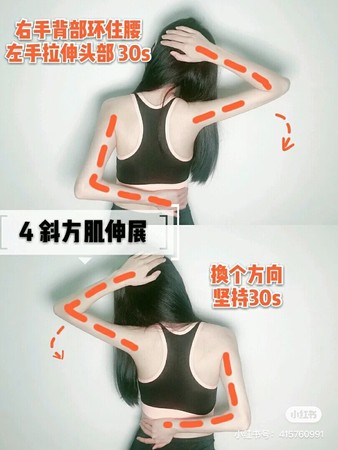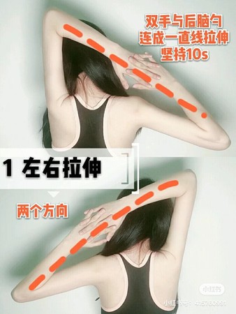 1.左右拉伸(左右各坚持10秒为1组,共做3组)
