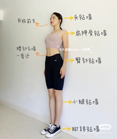 站立时,确保头、肩胛骨和小腿肚、脚跟贴著墙面,收紧腹部,让腰部与墙面有约一个拳头的距离,第一次站、不习惯的人可在维持姿势正确前提下,先站5分钟,再慢慢拉长时间至15~30分钟。