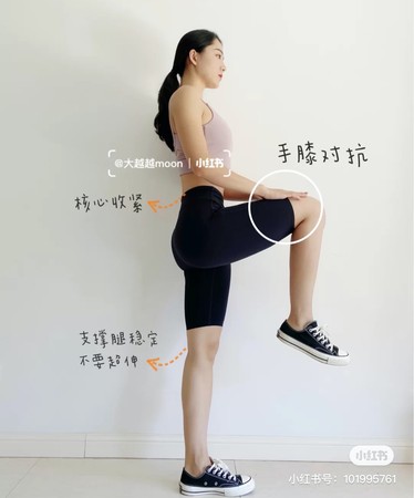 这个动作简单来说就是抬腿摸膝盖,可以帮助增加核心力量和下肢综合力量。一只脚稳定站直,另一腿弯曲90度抬起,双手交叠轻触抬起腿的膝盖,维持30秒后换腿,做动作时注意膝盖要打直但不要过于前倾、超伸,核心收紧。