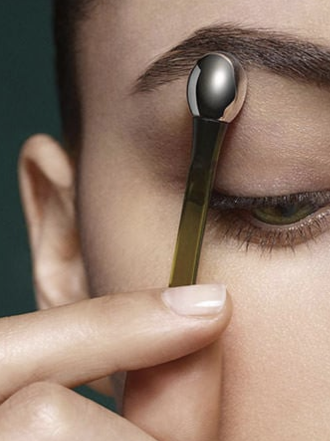 笔者早前也试用过La Mer的面霜,见证过皇牌成分的威力,今次试用这款眼部精华感受到品牌设计的用心。先说一说用法,购买眼部精华时会配备一支小小的金属按摩棒,按摩棒一边为圆拱形一边为平面,涂上精华前建议先用圆拱棒头刺激肌肤微循环,再泵出一滴精华,用无名指在眼周轻按,最后用按摩棒平的一面,由眼头至眼角轻轻打圈按摩眼周。