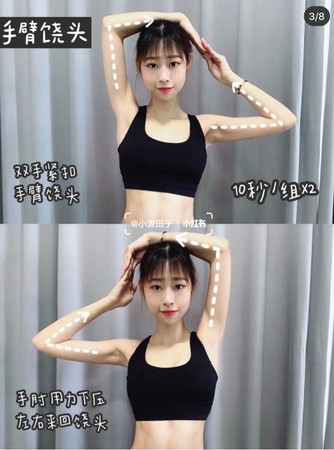 双手紧扣,用手臂绕头,将手肘用力下压,左右来回绕头,当后背产生微微酸痛感,就代表做对了。