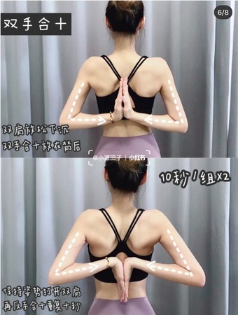 双肩放松向下沉,将双手合十放在背后,维持这个姿势然后打开双肩,接著再反手合十,重复10秒。