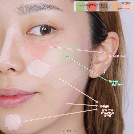 其实只要在妆前利用绿色、紫色或粉色等彩色饰底乳,针对相对应的肤色问题先校正调整,就能让后续底妆更轻薄,像是局部泛红用绿色校正,蜡黄肤色靠紫色修饰,暗沈肌肤靠蓝色增加透亮感。