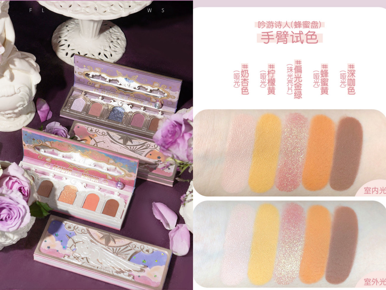 最近洗版到不行的FLOWER KNOWS其实是出自大陆的品牌,名为“花知晓”,不但在大陆当地爆红,甚至还火到日本、韩国去,可见它的包装是真心浮夸又打中女孩的心,以金属色搭配立体的独角兽、星星、欧式风格窗框,里面则是眼影的颜色,夸张度简直满分。