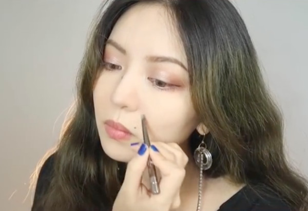 人中过长容易看起来有老气感,在画唇妆时只要多一步就能有减龄效果。涂好唇彩后,用指腹将上唇边缘往上晕开一些,再用小刷子沾取一点点的修容阴影粉,轻轻点在人中最上方打造一个很小的阴影,这样在视觉上看起来人中就好像缩短了一些。但记住下手一定要轻,不然会变成一个很明显的色块,会让妆容变脏。