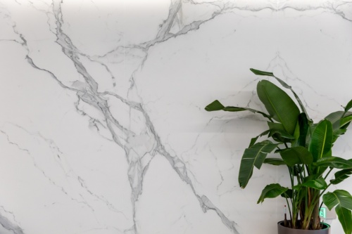 大厅色彩清晰明快,顶部均匀分布的线型灯带让整个空间更加具有科技感,由马可波罗曲面岩板打造的方柱将空间的高级氛围做了进一步提升,墙面使用马可波罗岩板轻纱鱼肚白定制连纹产品,1600mm*3200mm超大规格,使得产品纹理更加完整,且留缝少,更贴近天然石材的铺贴效果,实现原生态无界视觉效果。