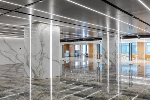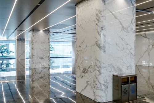 马可波罗岩板实景案例 | 数智恒生中心:曲面岩板重构线条之美,连纹设计彰显大美视界