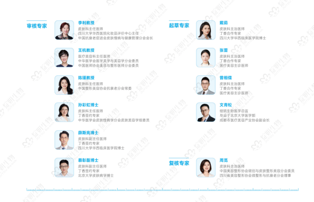 起草专家包括皮肤科主治医师、四川大学华西临床医学院博士戴茹,皮肤科主治医师张蕾,皮肤科主治医师曾相儒,同时还包括绽妍生物医学总监、成都市医疗美容产业协会副会长文青松。审核专家则包含皮肤科主任医师、四川大学华西医院化妆品评价中心主任李利教授,医疗美容科主任医师、中华医学会医学美学与美容学分会委员王杭教授,皮肤科主任医师、中国整形美容协会抗衰老分会常委陈瑾教授等6位皮肤科专家。《指南》的复核工作则由皮肤科主治医师、中国美容整形协会微创与皮肤整形美容分会常委、四川省美容协会微整形与抗衰老分会理事周觅完成。