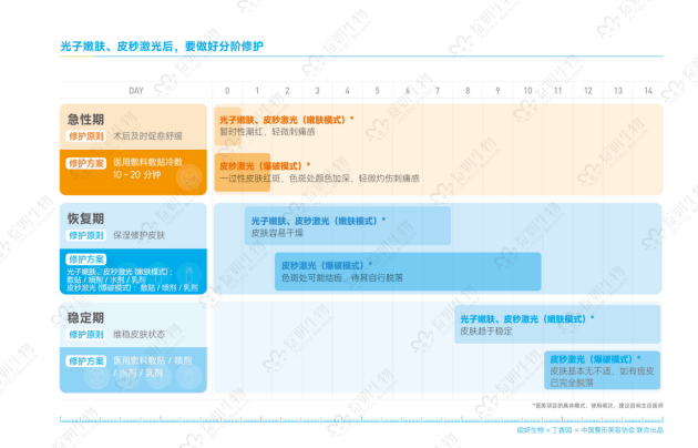 按照上述分类原则,针对常见项目,绽妍联合多位皮肤科专家进行详细的术后科学修护科普。以强脉冲光(光子嫩肤)为例,《指南》从是什么、适用场景、术前准备、术后注意事项以及急性期、恢复期、稳定期的修护进行介绍。通过图表的形式,直观提供修护原则和修护方案。