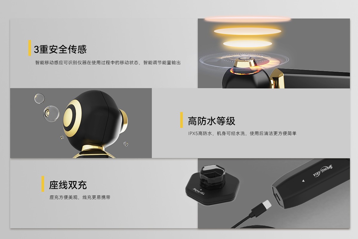 为了使产品兼具设计美感与实用创新,导头设计采用“旋转切换双导头”这一突破性创新理念:六芒星超大导头,“横扫”全脸;双环微凸导头,“精雕”细节。