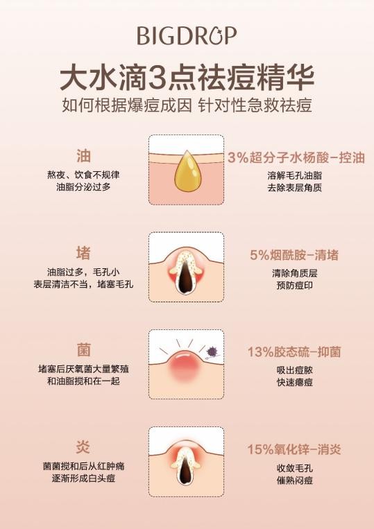在实际的产品研发中,大水滴熬夜肌实验室也将研究成果应用其中,并将"熬夜痘"作为第一个突破口,基于其"油、堵、菌、炎"的形成机理打造出了【大水滴3点祛痘精华】,从控油疏通、抑菌消炎、淡化痘印三个维度全面阻击“熬夜痘”,帮助熬夜人群有效应对熬夜后皮肤的油脂分泌异常和炎症反应。