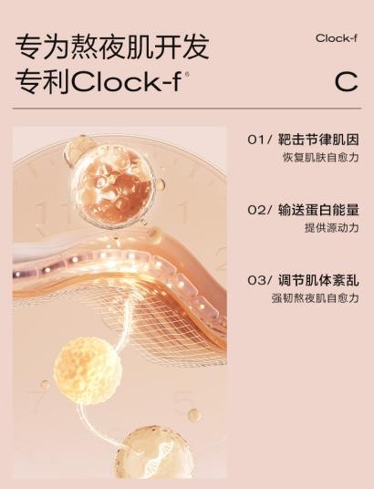 作为具有专研国人熬夜护理研究背景的新锐品牌,大水滴长期致力于开发适合熬夜人群的护肤产品。在2017年,大水滴受启发于诺贝尔生理学获医学奖关于基因调控昼夜节律分子机制的研究,潜心5年成立了全球首家熬夜肌实验室,并成功自研了一种能从内源拨正肌肤节律的成分——Clock-f。这种专利成分作用于Clock、Per等生物钟基因的表达调控通路,恢复节律蛋白的正常表达,能有效激活细曲胞,提升皮肤细胞能量,使熬夜后受损的屏障功能得到内源性改善,让国人对熬夜肌护理思路的研究不再仅仅局限于表面问题的解决。