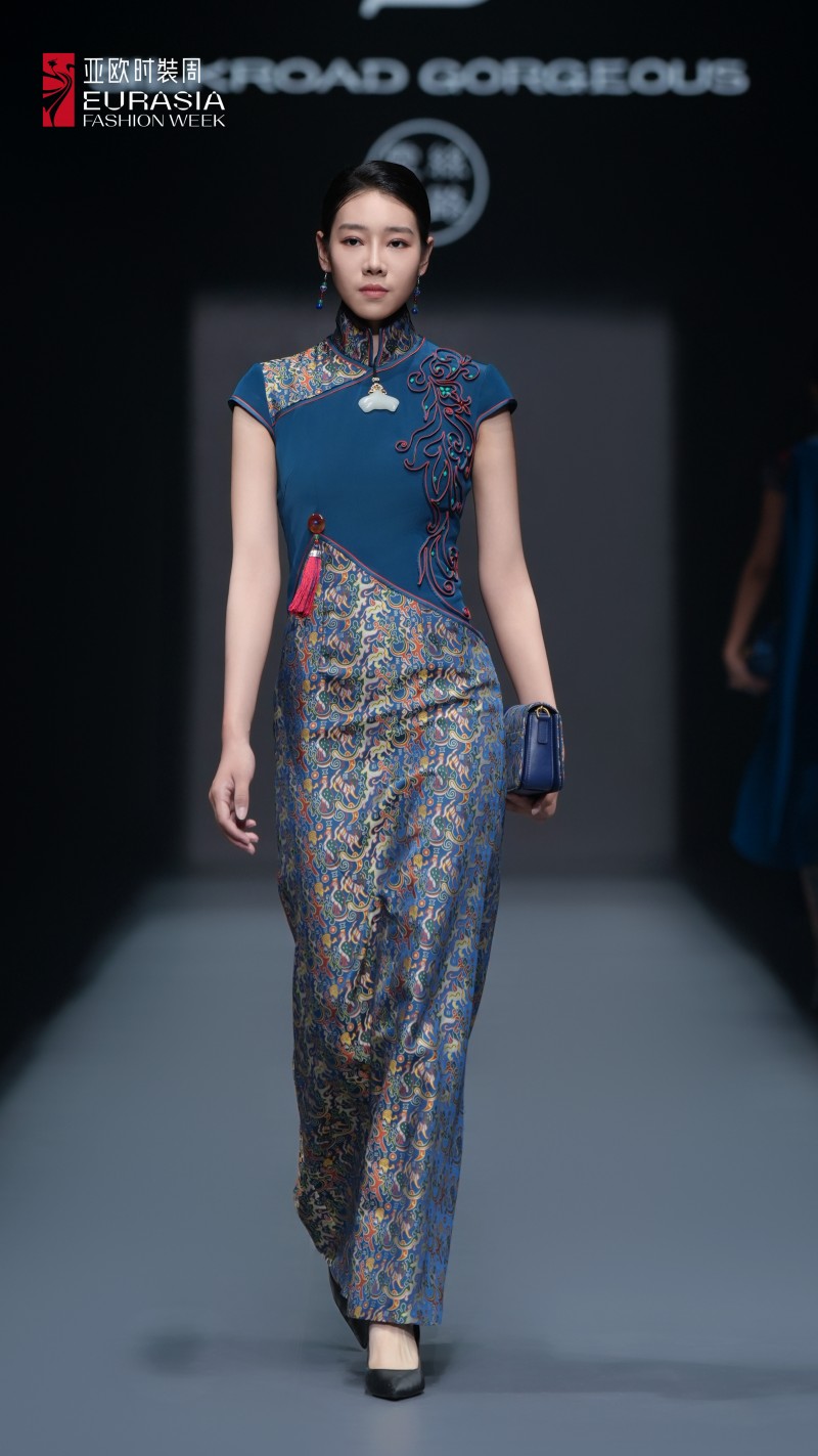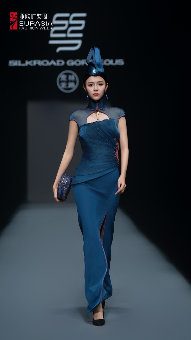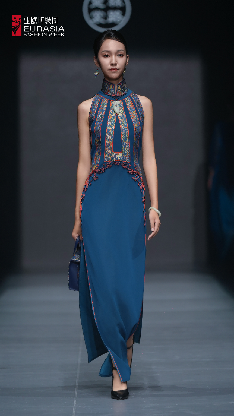 孙秀琴的“五星出东方”系列作品已经在国内外T台上闪耀了十几年。“‘五星出东方利中国’汉代织锦护臂是国宝级文物,更是中华文化瑰宝。我希望通过现代设计手法和工艺让这一文化元素在保护和活化中焕发新的生命力。”在本届亚欧时装周发布的作品中,她将“五星出东方”纹样以及宋锦、融合丝路文化特色纹案通过手工盘绣、钉珠等将多元文化融为一体,并结合了和田玉、玛瑙石等珍贵饰品,从表现形式、表现内容以及细节等,展现国宝文化的精致与深度。