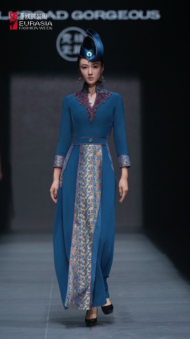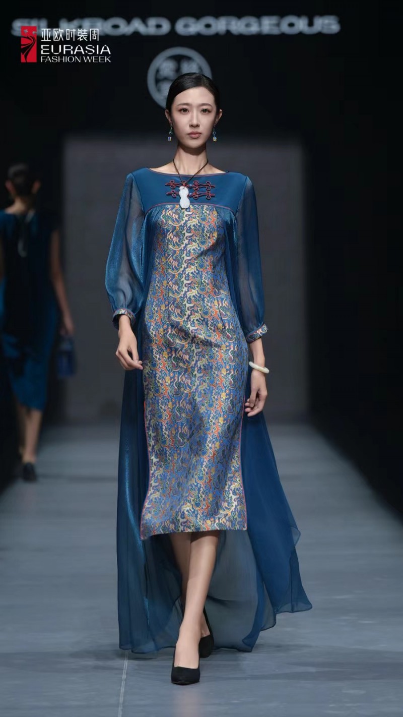 2024亚欧时装周开幕式上,新疆服装设计师协会会长、中国十佳服装设计师孙秀琴带来了作品《五星出东方·宋锦新中式》,各种“五星出东方利中国”汉代织锦护臂花纹的盛装,色彩斑斓、韵味独特,讲述着丝路霓裳背后的文化故事。