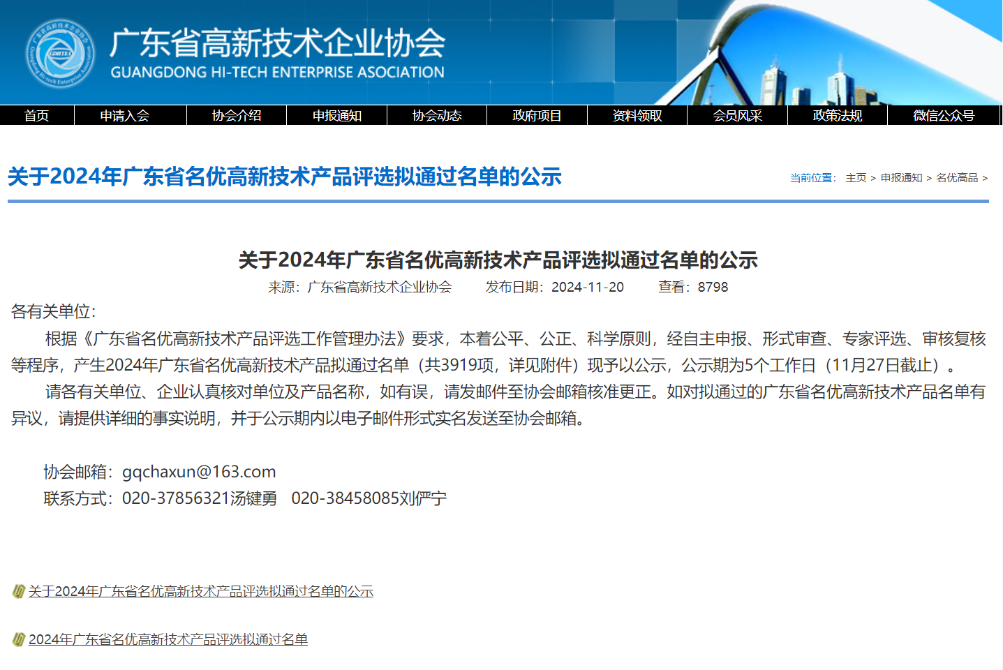 “广东省名优高新技术产品”作为一项省级技术荣誉,是对“广东省高新技术产品”的延伸和进一步升级,具备创新能力突出、技术先进、质量可靠、市场前景好等特征。评选主要从技术水平、知识产权、市场影响力、环保情况、产品获得荣誉等五项指标进行评价,旨在遴选一批国内首创可替代进口的、达到国际与国内先进水平的名优高新技术产品,为行业创新发展提供风向标。