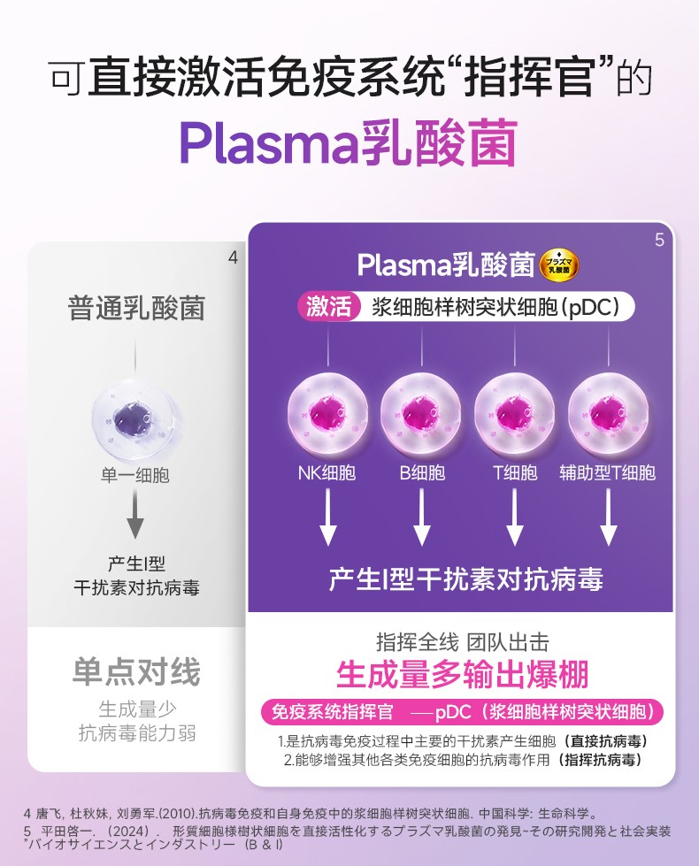 Plasma乳酸菌是全球首个,目前唯一被发现能够直接激活预防病毒感染免疫系统“指挥官”的乳酸菌,能直接作用于免疫系统的关键指挥塔——pDC(浆细胞样树突状细胞),从而高效支持免疫功能的维持。